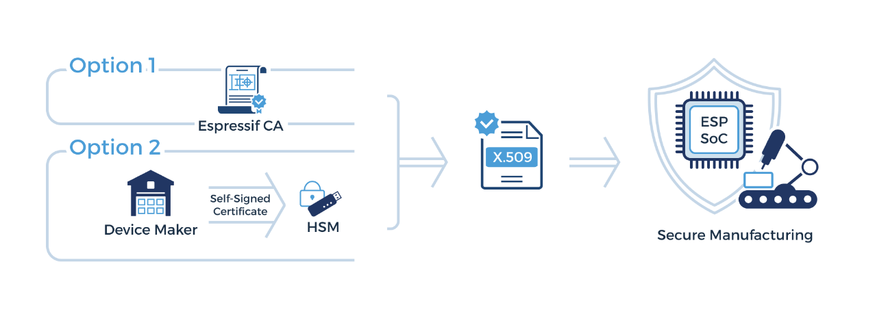 Customers can choose between CA-based provisioning—where Espressif injects signed X.509 certificates—or self-managed provisioning, where device credentials are created and signed using secure hardware like HSMs or secure tokens. These signed credentials are securely transferred to Espressif for flashing without exposing private keys. This flexible approach gives customers full control over their root of trust while leveraging Espressif’s secure, high-volume manufacturing infrastructure.